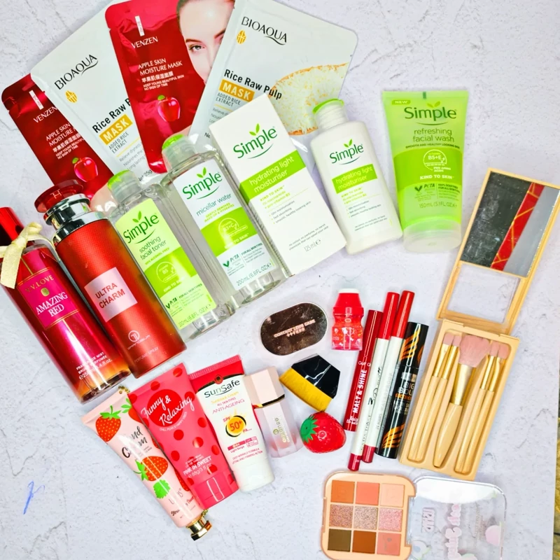 آیتم های داخل پک شامل پک ماسک ورقه ای،ست براش،پک روتین پوستی (شوینده صورت،تونر،میسلار،کرم مرطوب کننده و آبرسان) ضدافتاب،لوسیون بدن،بادی اسپلش،اسپری بدن ریمل،رژگونه،خط چشم،رژلب،بالم لب ،برق لب،سایه بعد از ثبت سفارش آیتم های داخل پک قابل تغییر هست با هر رنگ و قیمتی شما بخواین براتون پک میچینیم ارسال سریع به سراسر کشور