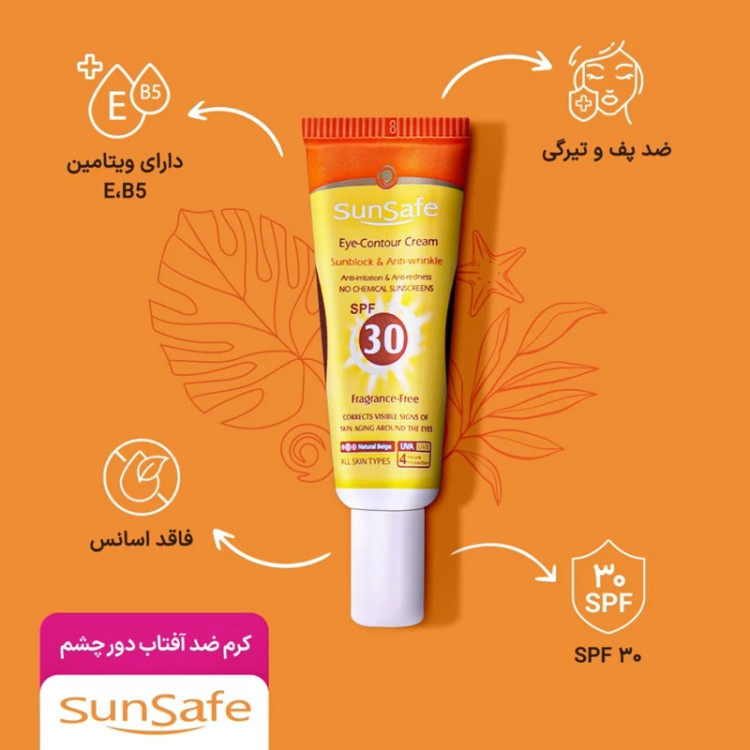 ضد آفتاب رنگی دور چشم سان سیف، تقویت ساختار پوست و مقاومت عروق خونی دارای رنگ بژ طبیعی برای پوشش تیرگی و لکهای اطراف چشم محافظت کامل از پوست حساس اطراف چشم در برابر پرتوهای UVA و UVB ضد آفتاب دور چشم سان سیف، با بافت سبک و جذب سریع کمک به کاهش چین و چروک، پف و تیرگی دور چشم موثر در حفظ رطوبت و جلوگیری از پیری زودرس پوست قابلیت استفاده به عنوان کانسیلر برای داشتن ظاهر شاداب و یکنواخت